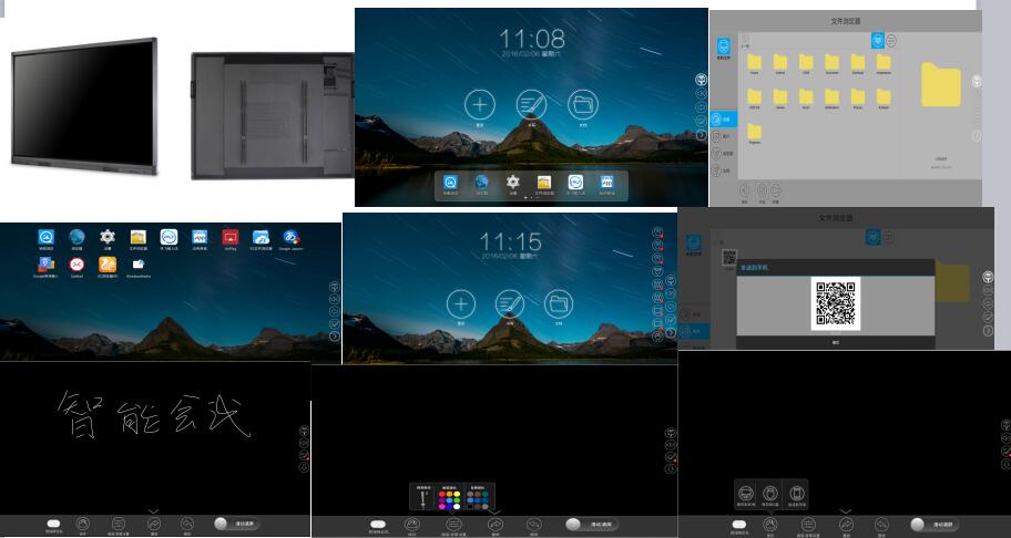 觸摸智能交互式會議機(jī)同時自帶設(shè)置(可查看本機(jī)配置信息)應(yīng)用商城(更新功能),瀏覽器(上網(wǎng)播放查詢),文件管理/ES瀏覽器(存放資料),歡迎程序(可現(xiàn)場制作歡迎語)屏保(類似手機(jī)屏保),無線操作步驟,快圖查看,WIFI分析儀(查看哪個網(wǎng)絡(luò)連接信號),遠(yuǎn)程會議等功能