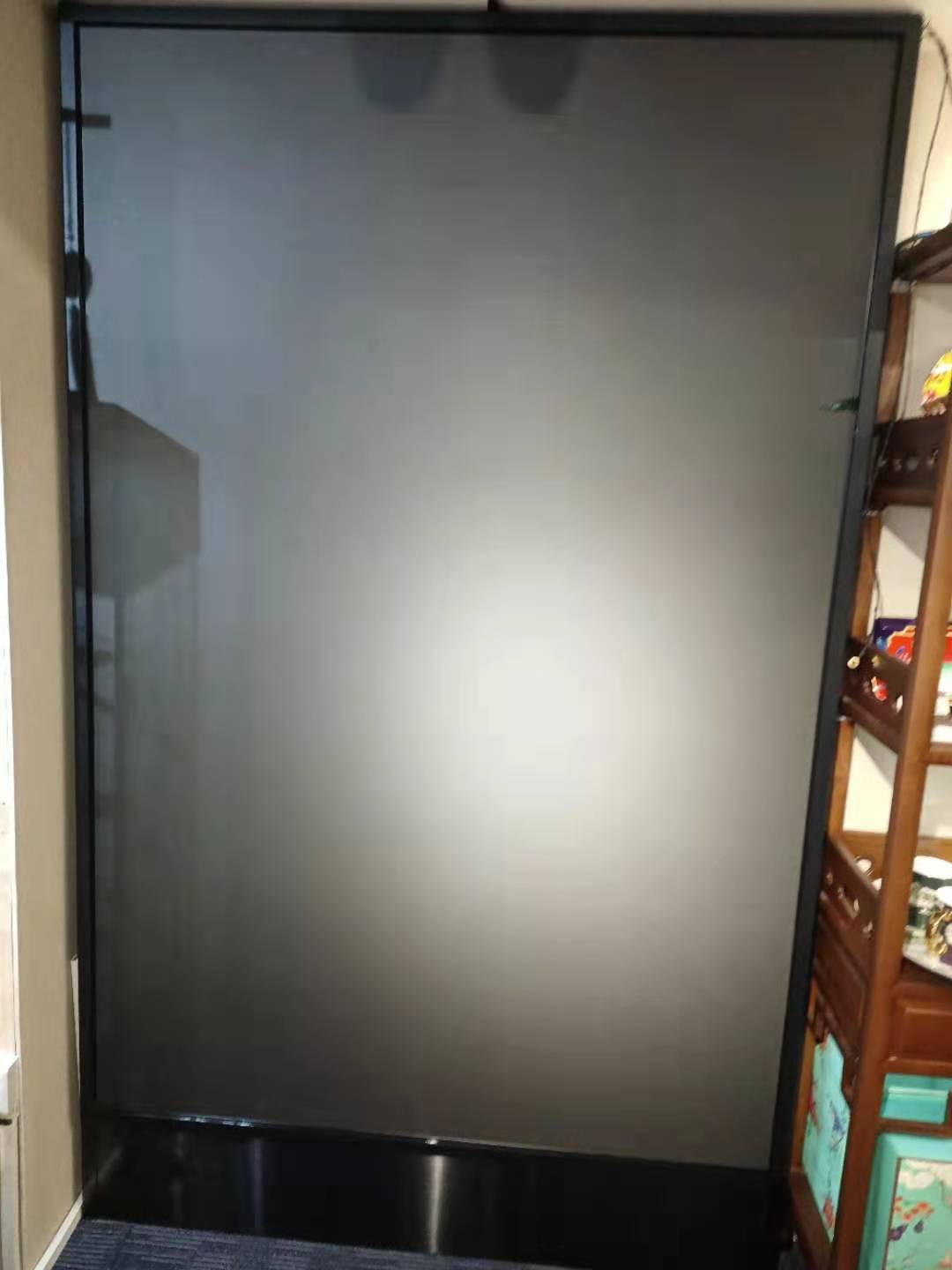 2、表面加上8MM鋼化玻璃,玻璃大小根據(jù)面積大小而定可整塊可以分多塊,固定在支架上或者墻面將觸摸框貼在四周即可(參考圖2)