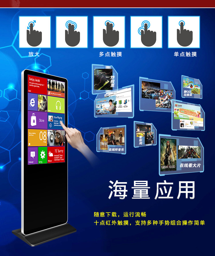 安卓觸摸一體機結(jié)合液晶屏、紅外多點觸摸屏和最前沿安卓操作系統(tǒng)集成時尚外觀的前鋁型材前框后殼五金烤漆殼子里面、安卓觸摸廣告屏豐富接口有多路USB接口,USB接口支持高清流媒體放映功能、多路HDMI高清接口輸入輸出輸入,觸摸一體機搭載安卓5.0以上智能操作系統(tǒng)和獨特UI設(shè)計,給你帶來更便捷的操作和更佳視覺體驗、安卓系統(tǒng)觸摸一體機可以安裝各大領(lǐng)域APP應(yīng)用軟件如微信、QQ、客戶端同時支持互聯(lián)網(wǎng)海量應(yīng)用下載,聊天,查詢、學(xué)習(xí)、購物、閱讀應(yīng)有盡有。