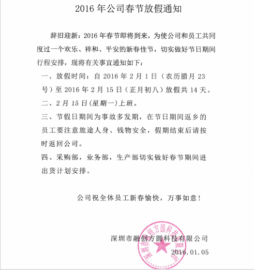 您現(xiàn)在的位置:首頁(yè) > 公告 > 融創(chuàng)方圓科技春節(jié)放假通知