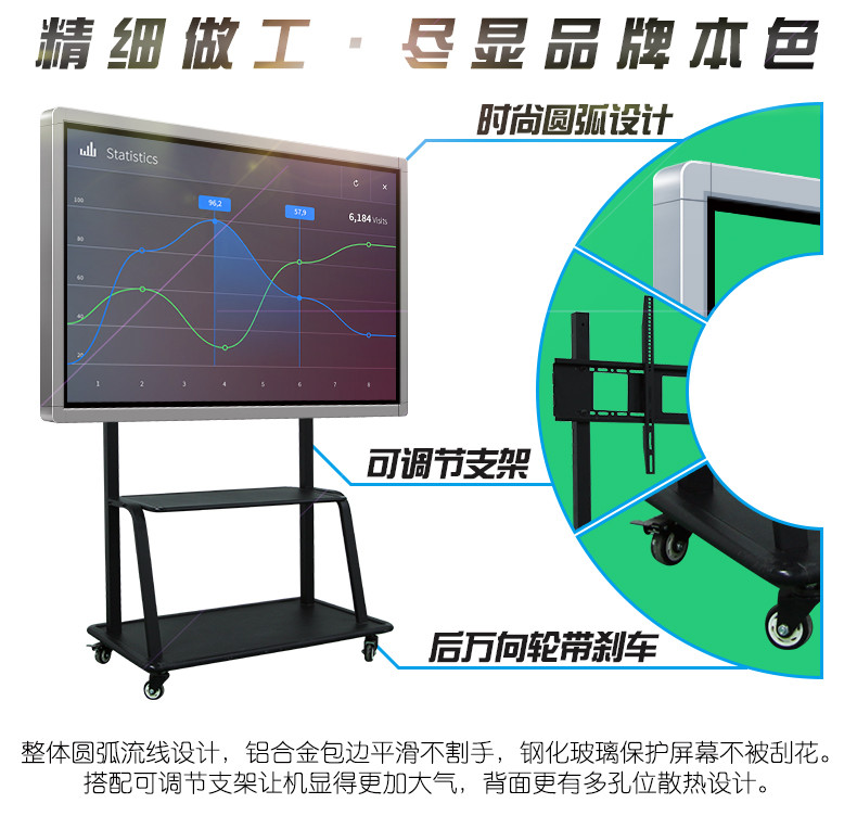 移動(dòng)觸摸一體機(jī)包含了高清顯示功能、電腦所有功能,電視功能所有功能,手機(jī)平板所有觸控功能,音視頻功能、圖像處理功能、自動(dòng)設(shè)置開關(guān)機(jī)功能、操作界面美觀清晰、使用簡便、功能齊全等優(yōu)點(diǎn),直接在觸控屏一體機(jī)屏幕界面里面支持循環(huán)視頻,文字,圖片播放也可以在觸控顯示屏幕根據(jù)菜單查詢自己想要信息。