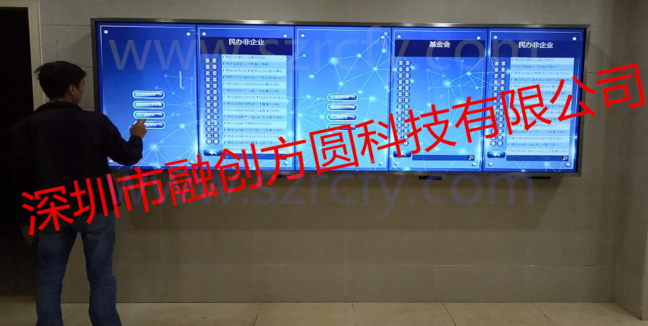 主要用途:通過融創(chuàng)方圓46寸1×5豎屏拼接屏真10點觸摸屏展示墻配套給社會組織中心專門定制應用軟件相結合,在軟件界面上做相應菜單導航鍵,可供民眾在超大互動觸摸大屏上多人操作點擊查詢自己想要資料信息。