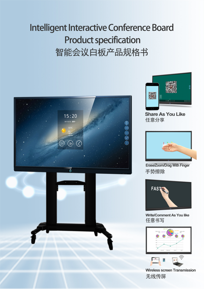 融創(chuàng)方圓98寸無線傳屏?xí)h平板帶來了全新的展示方式和交互方式,不需要關(guān)掉、連接線、記筆記、插U盤等繁瑣操作,98寸會議平板無線傳屏平板支持筆記本電腦、智能手機(jī)、智能平板可輕松將畫面內(nèi)容無線傳屏至交互式會議平板上。只需站在大屏前就能觸控翻頁,還可以隨時(shí)對重點(diǎn)內(nèi)容進(jìn)行批注,幫助展示變得連貫而流暢。